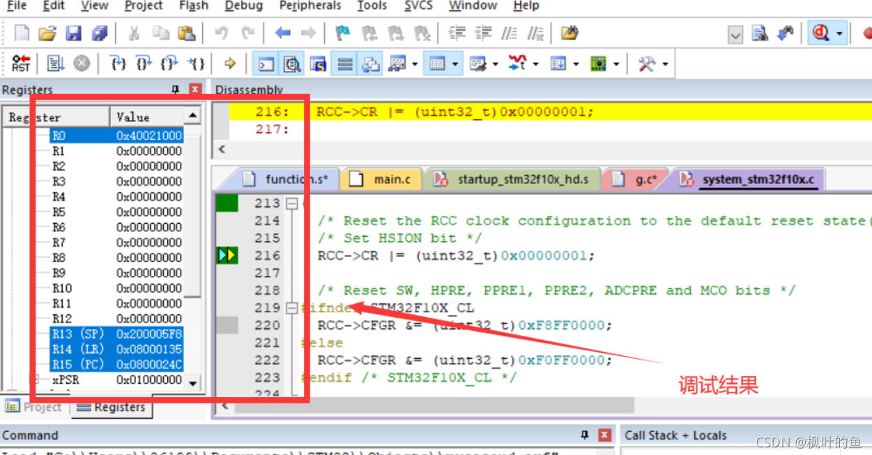 1.在汇编程序中设置好各参数的值。本例中有6个参数,分别使用寄存器R0存放第1个参数,R1存放第2个参数, R2存放第3个参数, R3存放第4个参数, 第5个、第6个参数利用数据栈传送。由于利用数据栈传递参数,在程序调用结束后要调整数据栈指针。C程序g( )返回6个参数的和