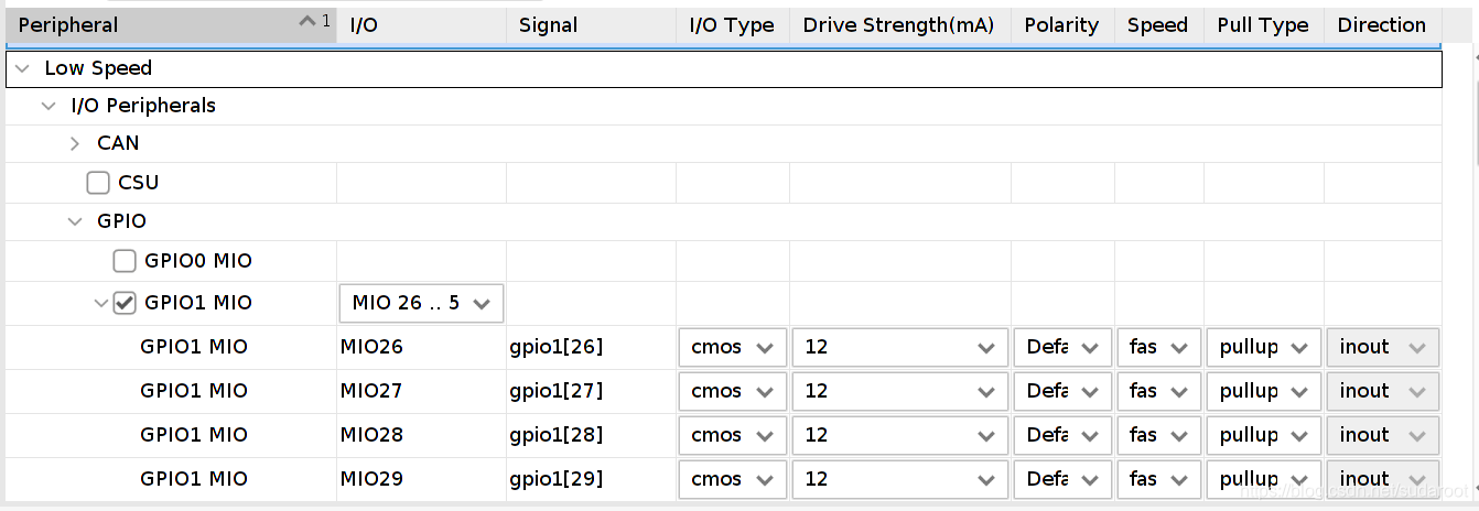 KEY所在引脚是MIO26,LED的所在的引脚是MOI40 ,那么在GPIO外设这项选中GPIO1 MIO该项,该项意思是选中MIO26~MIO51这个范围。下拉还能设置其他的功能,如速度,上下拉,输出输入等。