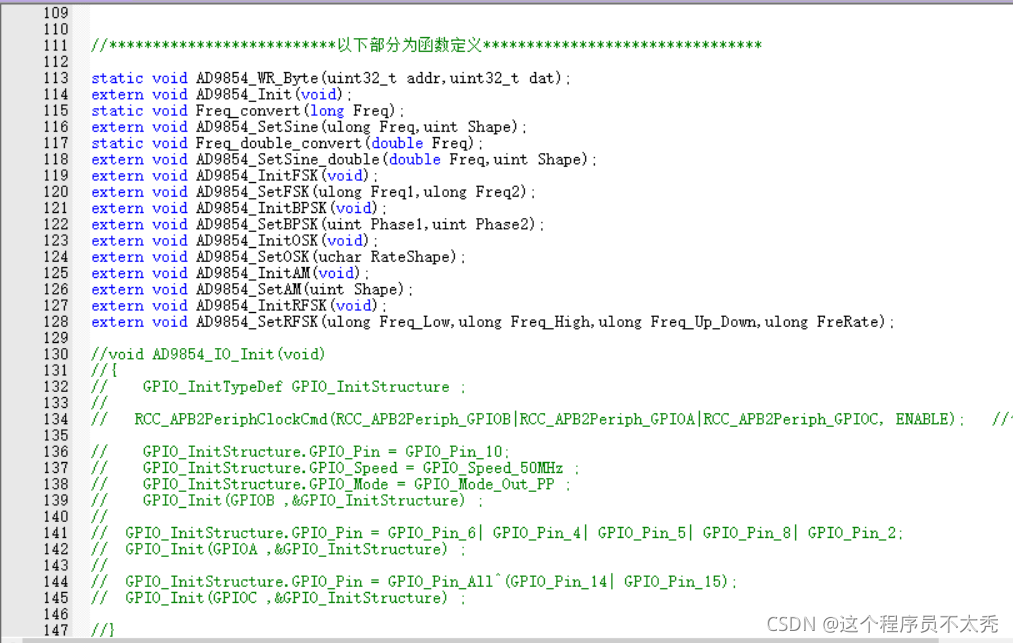 ?(1)void AD9854_IO_Init(void);//.c文件中 需要注释,因为引脚已经默认初始化。如图: