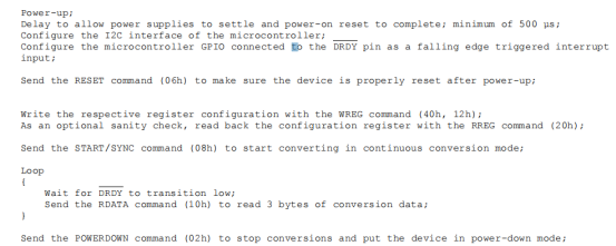- 然后START/SYNC命令启动转换,循环检测DRDY信号是否低电平,为低则RDATA命令读取转换结果。