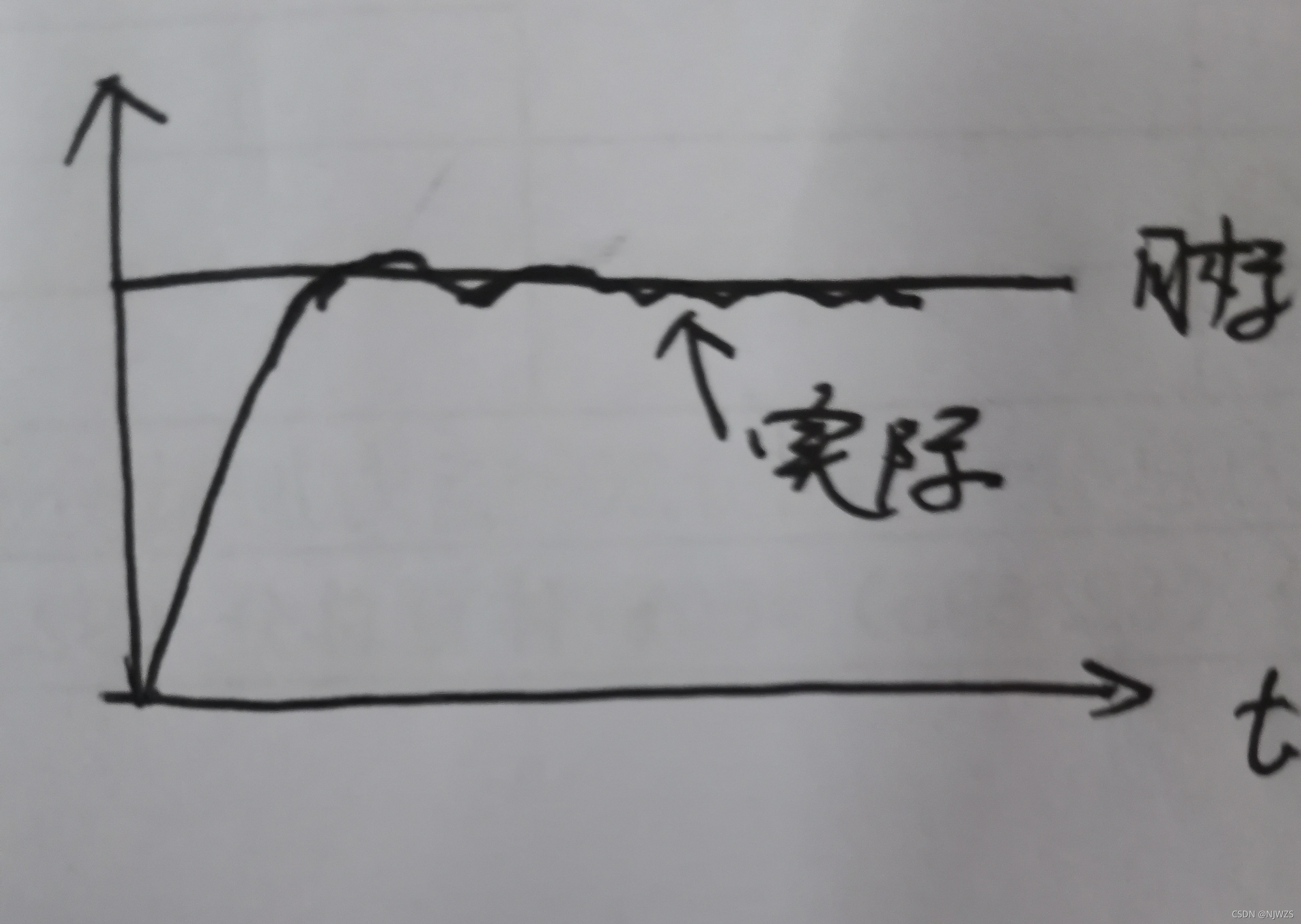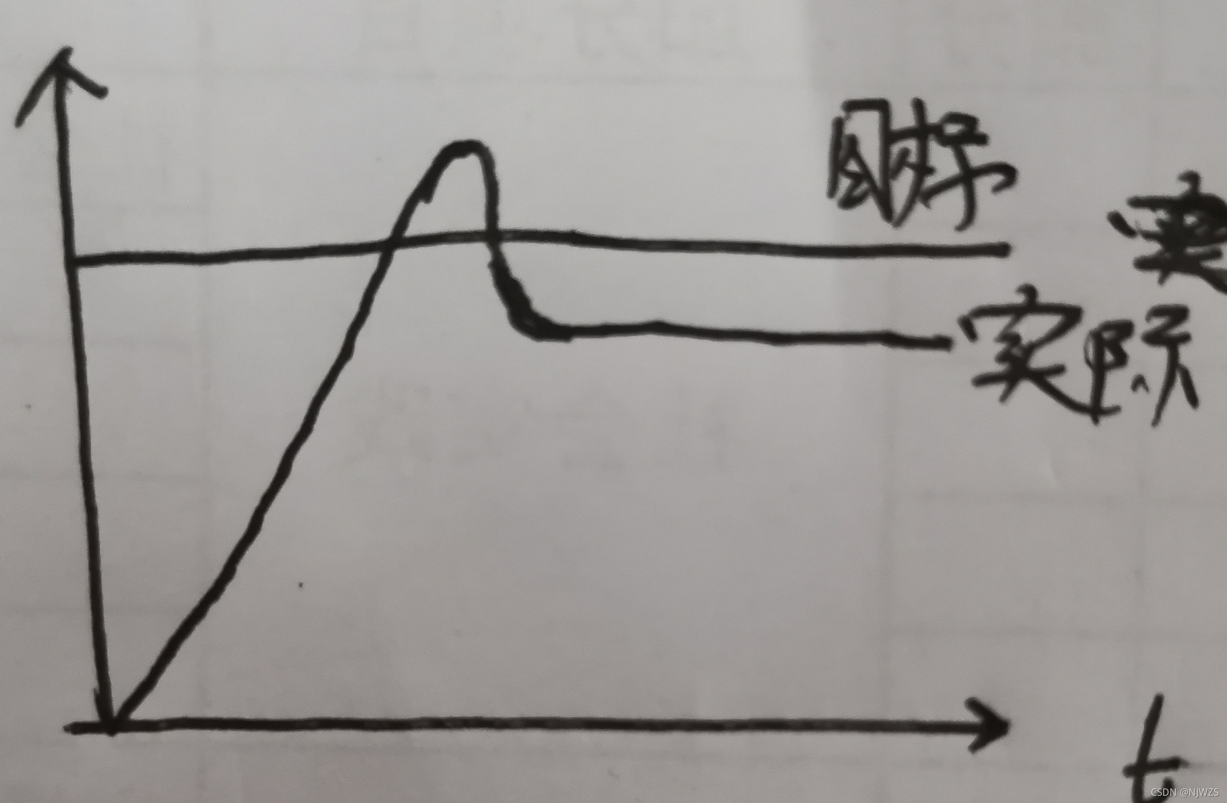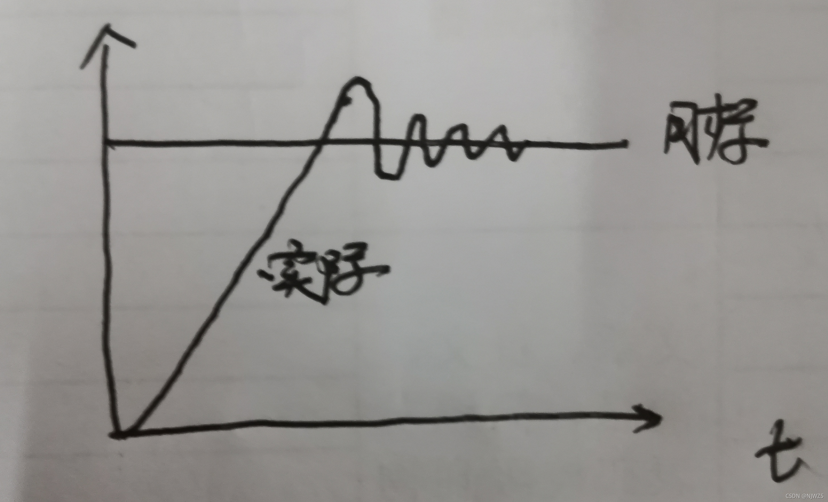 大家就会很好奇,实际为什么永远到不了目标,这是因为阻力的作用,我们知道电机轮子在运转时会受到空气阻力的影响,当P较小时,在一个微妙的时刻反馈给输出的值恰好等于空气阻力抵消的值?,就会产生一个微妙的平衡,并一直保持这种平衡。这时,我们需要在同一个数量级的条件下适当的调大P的值,调大到实际值前期稍微超调,后期略小于实际值,这是很理想的状态,如下图: