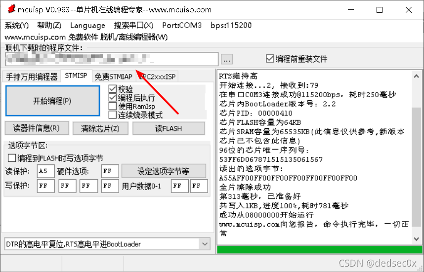 ? 下载mcuisp,打开软件,编译keil项目生成的HEX文件。