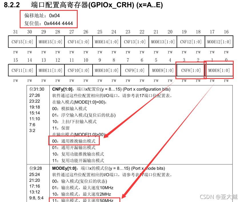 因为00与11组合为3,即输出模式为推挽输出模式,最大速度为50MHz