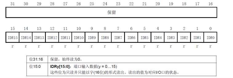 ? ?IDR是一个端口输入数据寄存器,只用了低16位。该寄存器为只读寄存器,并且只能以16位的形式读出。该寄存器各位的描述如图所示: