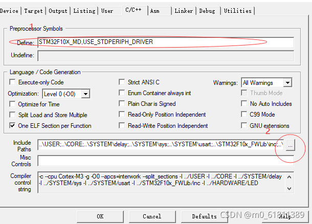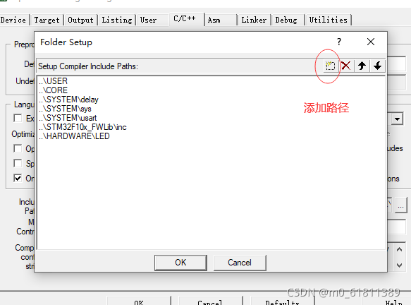 ?然后点击C/C++,将Define设置为USE_STDPERIPH_DRIVER,STM32F10X_MD,然后点击右下方的添加按钮添加Include Paths的路径