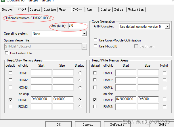 点击魔法棒->Target,可以看到STM芯片为STM32F103C8,修改晶振频率值为8?