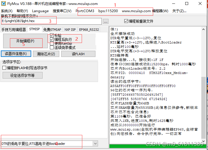1.搜索串口,设置波特率 115200(尽量不要设置的太高) 2.选择校验、编程后执行