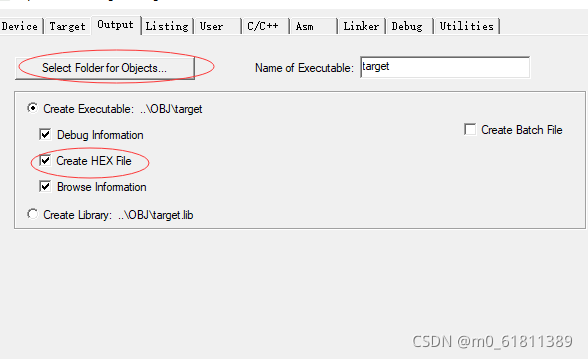 点击Output,其中select folder for objects是选择生成的hex存放的目录,这里选择存放在建立的OBJ文件夹中,Create HEX File用于生成可执行代码文件