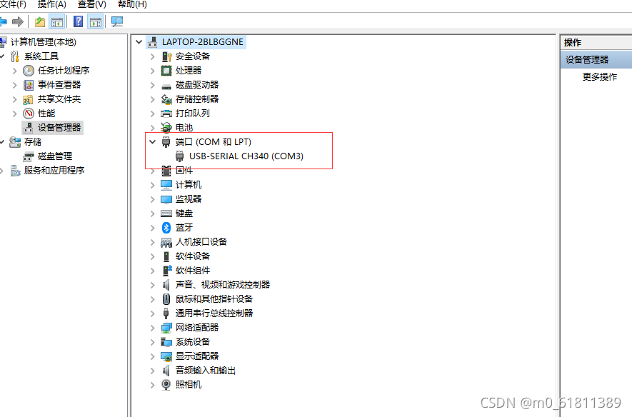 实验用到的STM32 开发板的,USB 转串口的驱动芯片是?CH340,所以要先在电脑中安装 USB 转串口驱动CH340 版本可以在右击此电脑->管理->设备管理器,查看是否成功