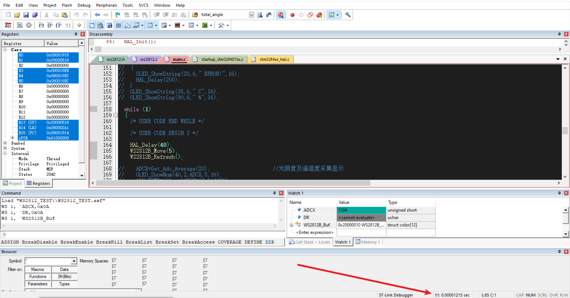 debug测试方法 在测试函数前后加上断点放在while内,进入debug后看右下角  如果是t0就右击选择t2或者t1。 在测试函数前的断点停下时再右键把数值清零,到结束的断点停下时显示的值就是延时函数实际的时间