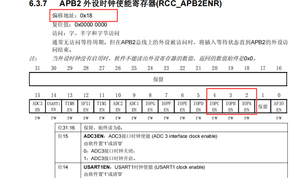 即0x40021018,则打开三个IO口的时钟需要将三个位都置1: