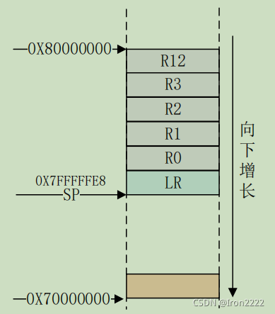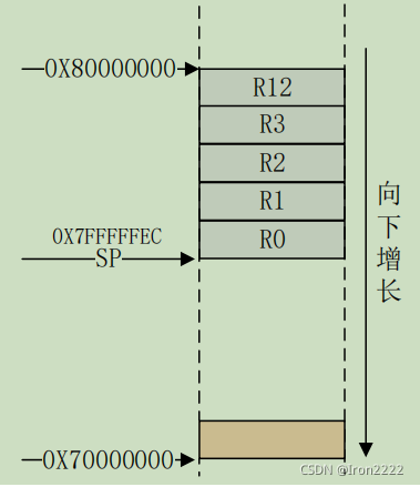 PUSH {R0~R3, R12} @将 R0~R3 和 R12 压栈