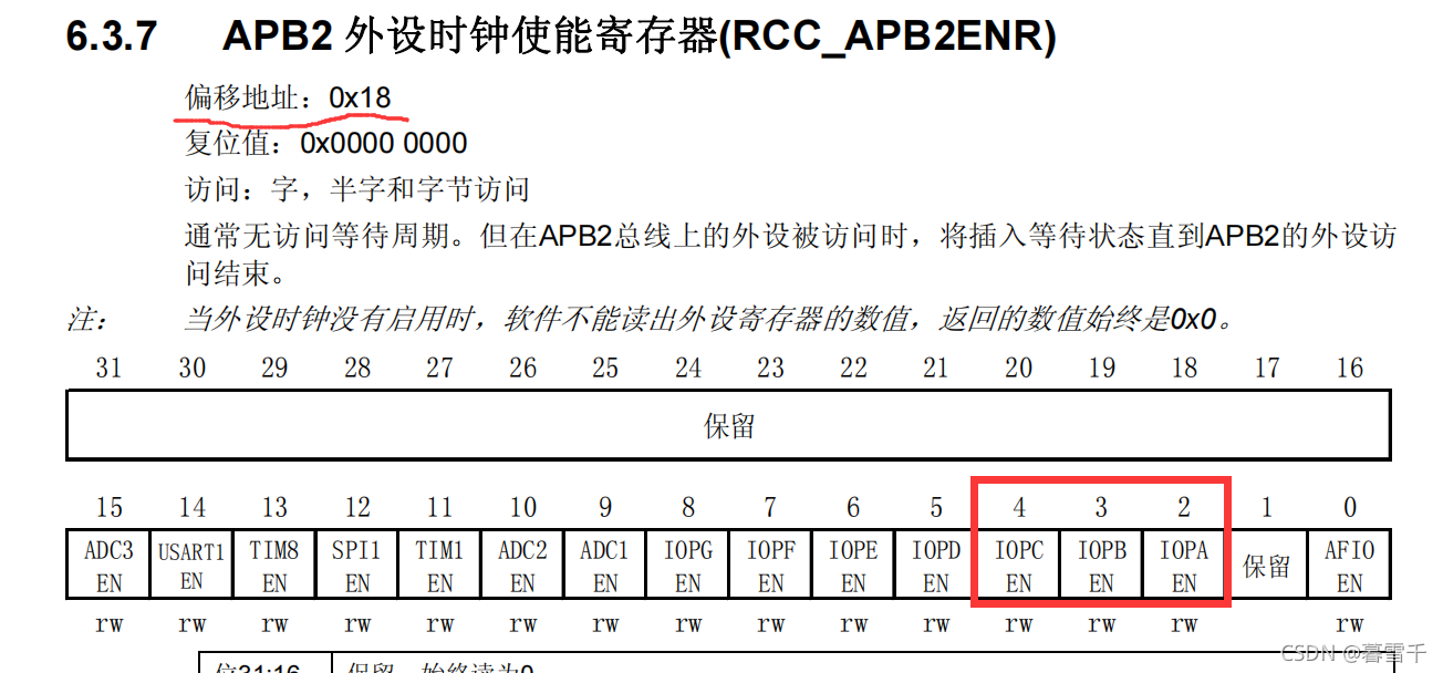 RCC_APB2ENR|=1<<2|1<<3|1<<4; //APB2-GPIOA、GPIOB、GPIOC外设时钟使能