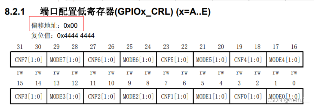 ?本次实验采用通用推挽输出模式,最高输出时钟频率2Mhz。分别用到A4、B5、C14三个引脚。其中A4、B5属于端口配置低寄存器偏移地址为0x00,C13属于端口配置高寄存器偏移地址为0x04。