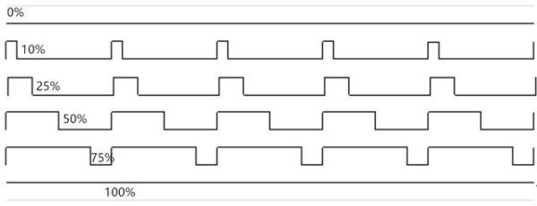 PWM是脉冲宽度调制,我们可以用这样的图来表示:  这是时钟线,但是这个时钟线50%是0V,50%是5V,所以这个占空比是50%,而下面的这张图就是不同的占空比,还有在讲一下什么是占空比,占空比就是高电平的长度除于总长度乘于百分之百,得到的就是占空比, 这个是不同的占空比的: