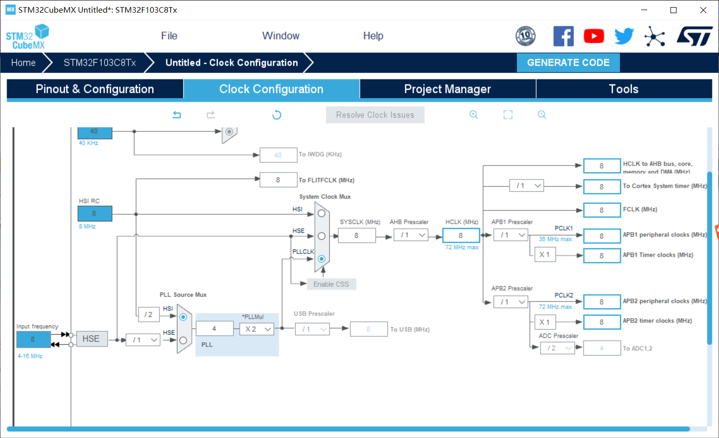配置时钟 将RCC下的HSE设置为Crystal/Ceramic Resonator: