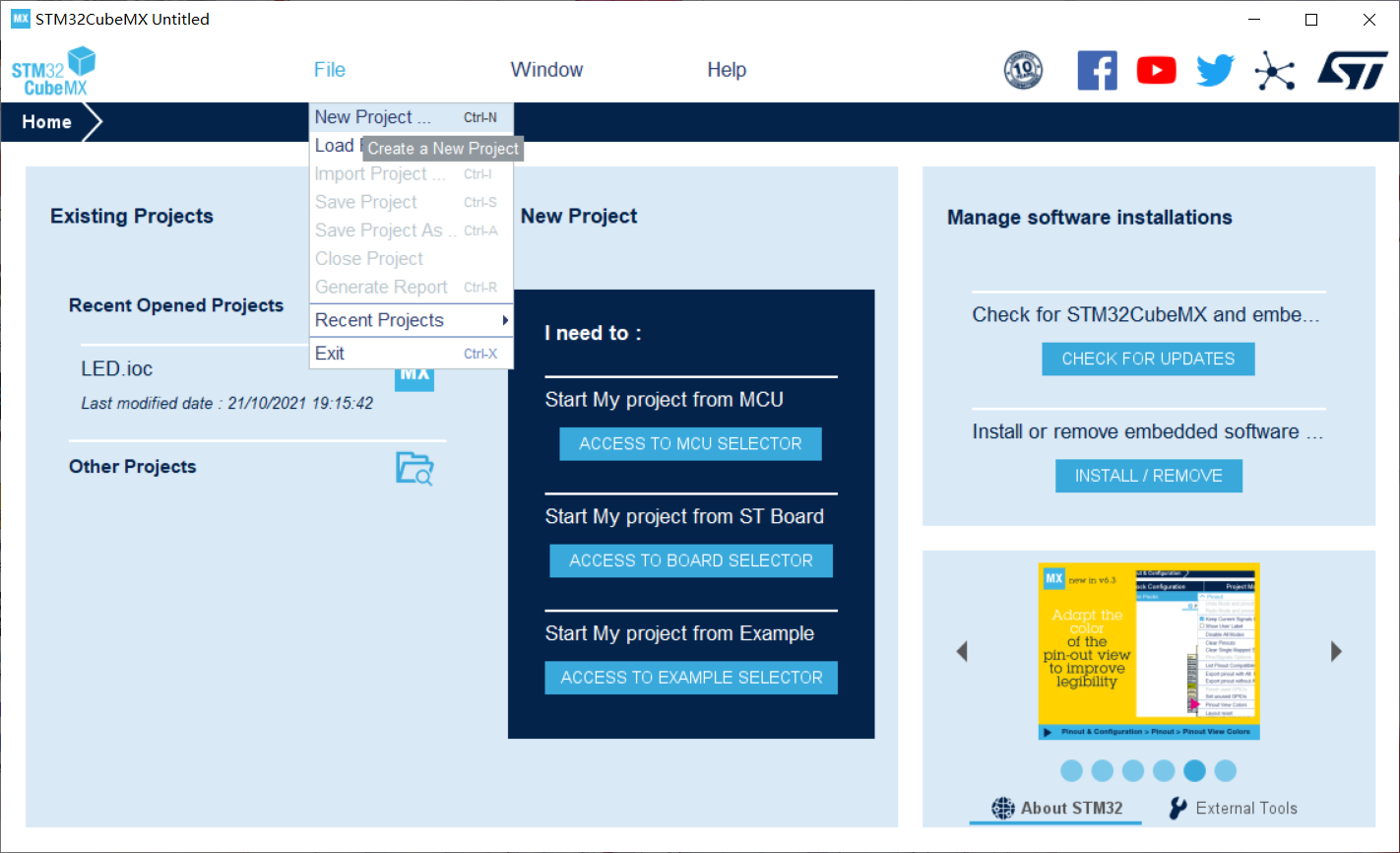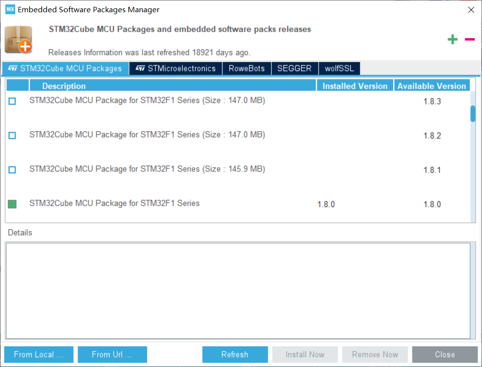安装固件库 运行CubeMX 4.27,选择 Help->Magne 安装固件库 下面第一个按钮是从本地安装(已经在本地下载了对应的固件库),Install now是通过网络下载,一般不推荐这种方式。