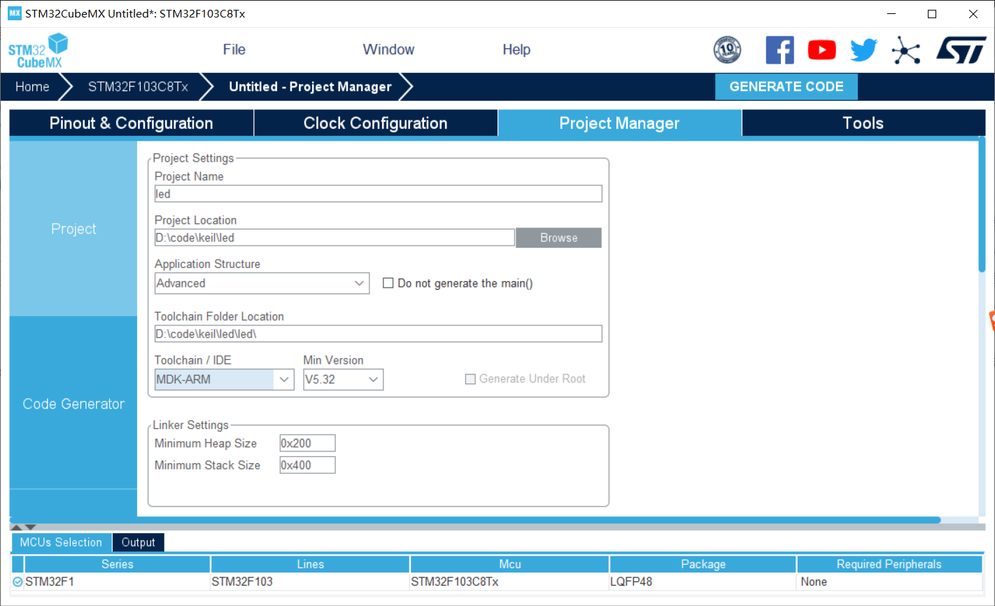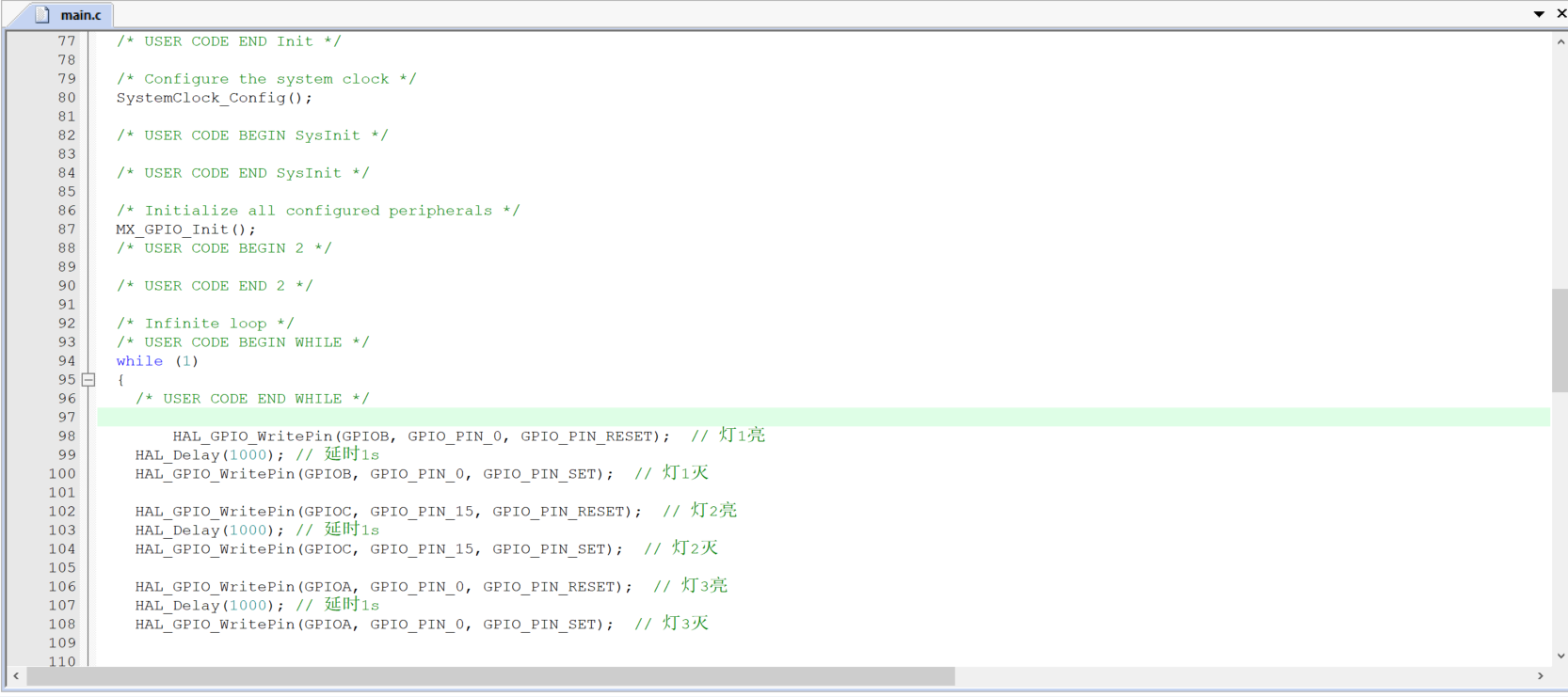 将三个引脚的输出默认改为High,即高电平:  项目配置 在Project Manager下的Project中设置工程名称和工程路径,并选择编译软件:  打开项目中的main.c文件,在while循环中写入以下代码: