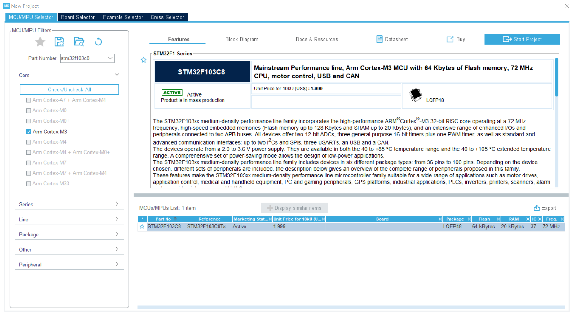 使用B0、C15、A0三个引脚。 选择File下的New Project,即新建项目:  选择自己的芯片类型(本文为stm32f103c8t6),选择下边的item,然后Start Project: 选择System Core下的SYS,将Debug设置为Serial Wire: 选择System Core下的SYS,将Debug设置为Serial Wire: