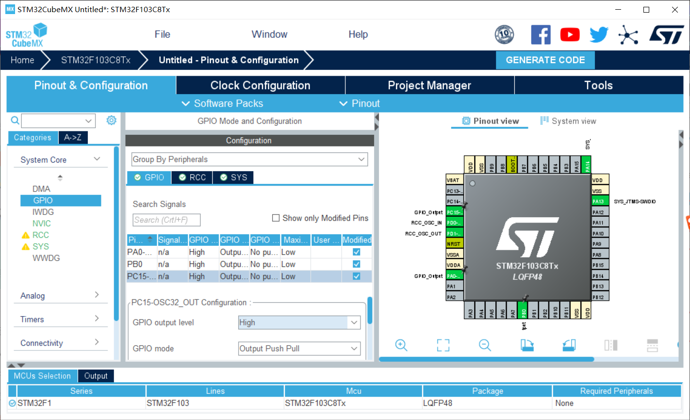 选择Clock Configuration,选择PLLCLK如下:  GPIO设置 选择GPIO,依次将B0、C15、A0设置为GPIO_Output:
