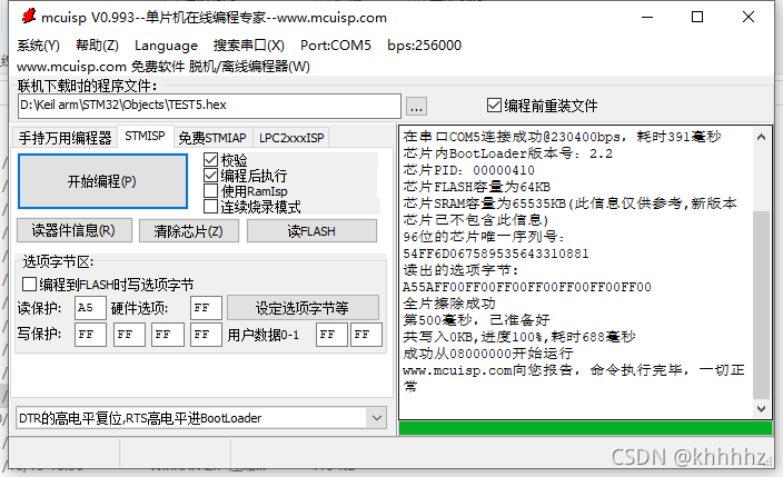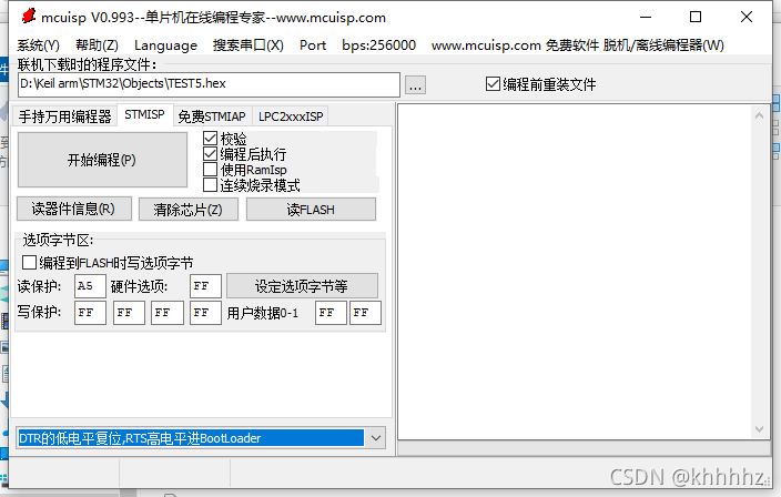 ?下载烧录工具软件mcuisp,接入电路,点击搜索串口,设置bps为256000,最下方设置为DTR的低电平复位,