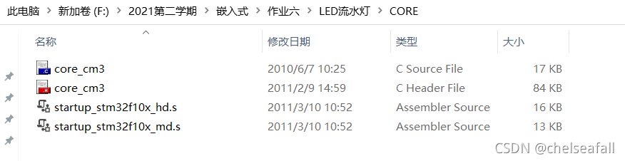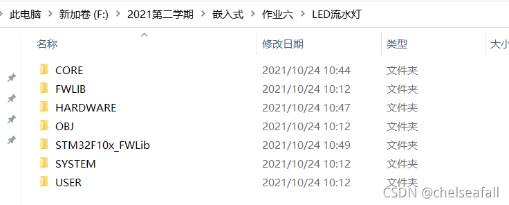 为了更好地学习stm32,调用库函数,建立工程模板是十分必要的。新建一个总文件夹,用来存放本次工程的所有程序,然后再建CORE、HARDWARE、OBJ、FWLIB、SYSTEM、USER这六个文件夹。