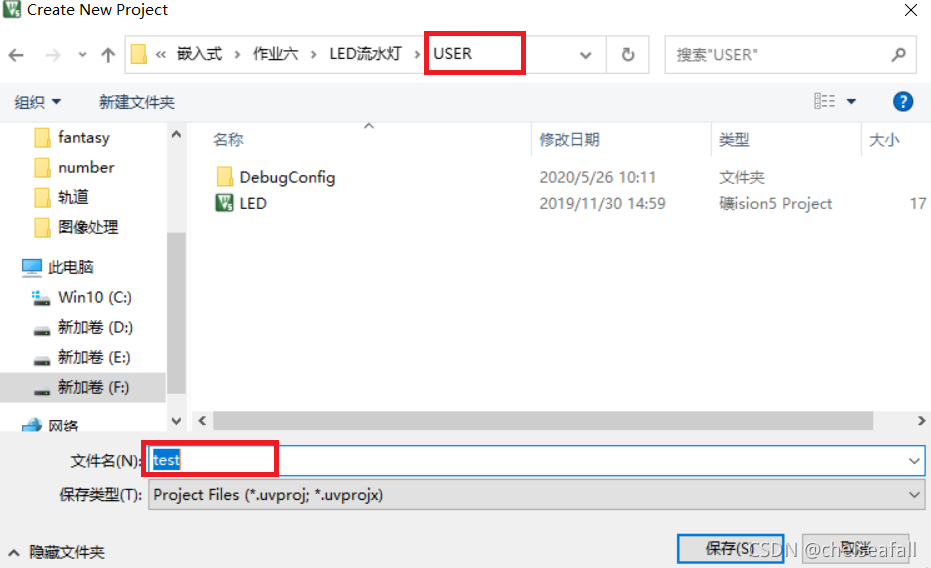 单击keil菜单栏中的Project中的New uVision Project 新建一个工程,将其保存到USER文件夹中