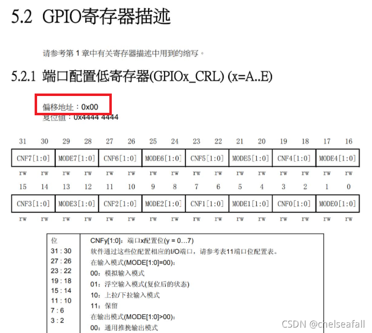 (2)找到GPIO寄存器的端口配置低寄存器的偏移地址为0X00