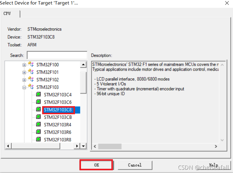 ?设备选择STM32F103C8,然后单击OK