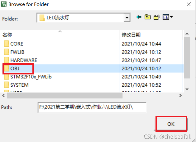 在Output栏中点击Select Folder for Objects,选择生成的hex文件存放的目录,这里选择存放在前面建立的OBJ文件夹中,然后勾选Create HEX File,用于生成HEX文件,下载到开发板的