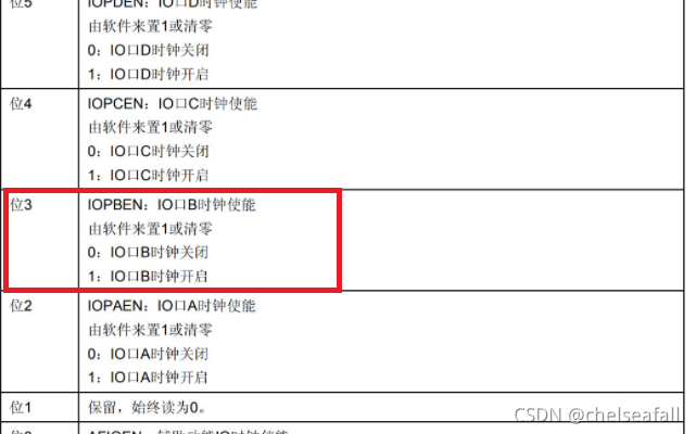 (3)找到时钟使能寄存器的地址为RCC_APB2ENR寄存器的位3控制GPIOB时钟的打开与关闭,置1控制时钟的开启
