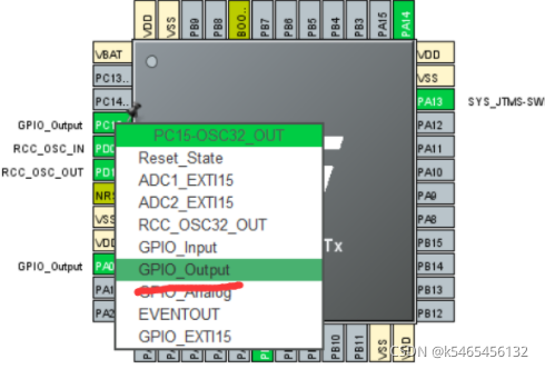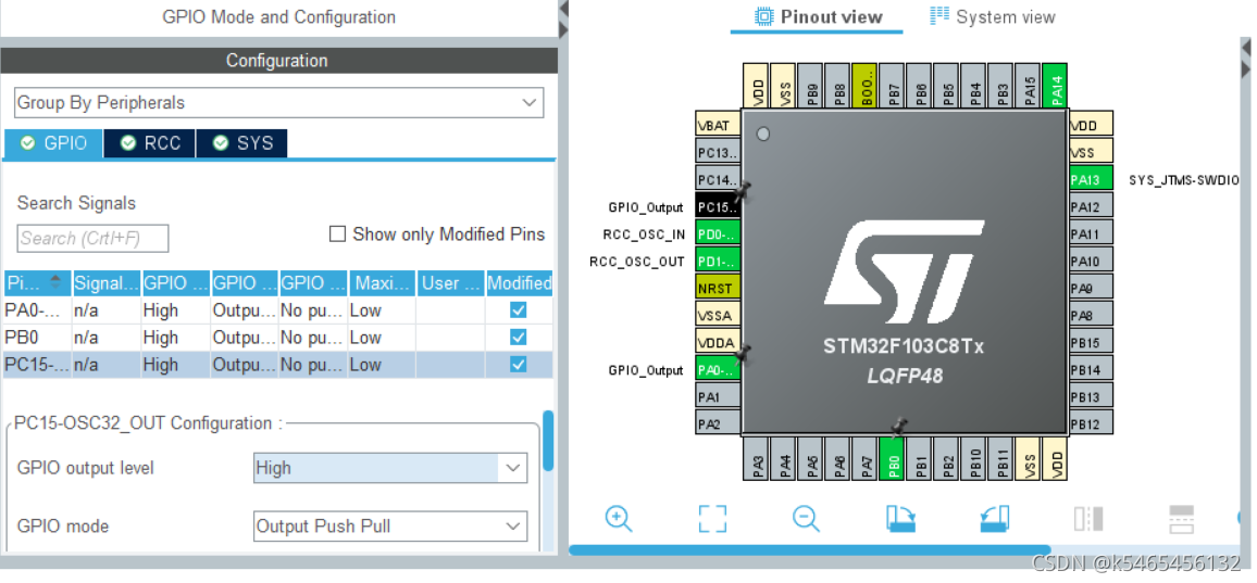 之后我们选择GPIO,分别点击B0、C15、A0,将B0、C15、A0设置为GPIO_Output ,随后我们把这几个引脚的相关GPIO output level改成high,改装好如图所示: