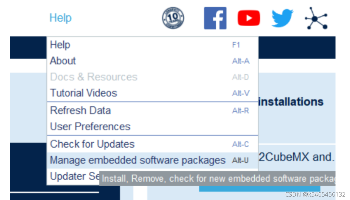 (二)固件库的安装 点击 Help -> Manage embedded software paclages?