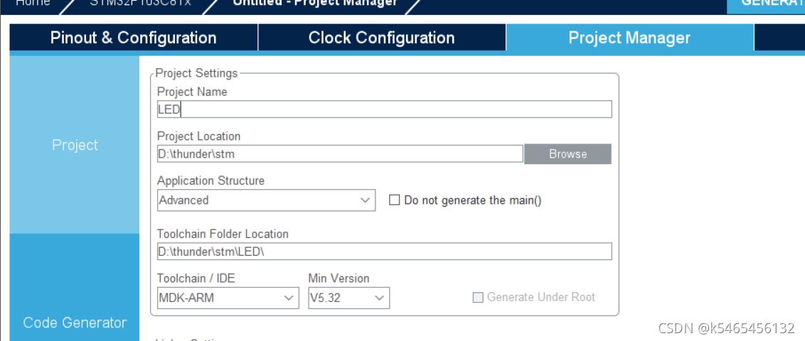 ?接下来,我们进行project manager的设置?,首先设置project name,然后设置project location,建议是全英文名,不然会出现相关的问题,然后将toolchain/IDE调成MDK-ARM,将Min VersionV5.32,然后在Code Generate中选择第一个,然后点击Generate Code,后面只需要等待就好了。