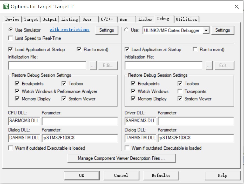 在开始仿真之前我们需要对keil进行一系列的配置,点击“仙女棒”,然后在Debug选项中选择软件仿真(use simulator),并且将下面的设置(Dialog DLL和Parameter)改成你对应的芯片即可。?
