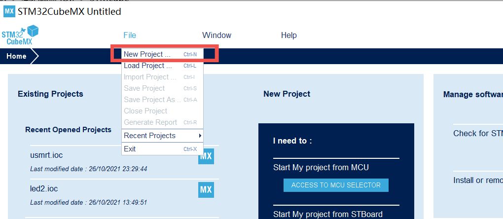 首先,我们打开STM32CubeMX点击右上方的File,选择New Project,创建一个新的项目: