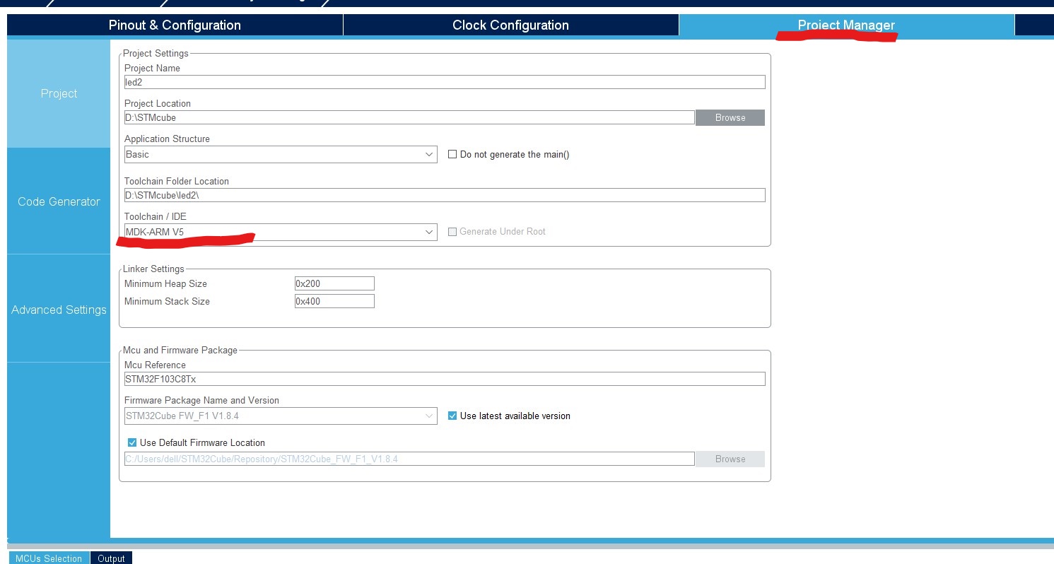 其中,Project name为项目名称,Project Location为项目的保存路径,要记得Toolchain/IDE选择为MDK-ARM,否则无法生成keil的工程。?