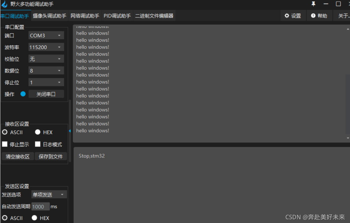 ?打开串口后,即可开始发送,选择"Stop,stm32"即可暂停发送,具体如下图所示: