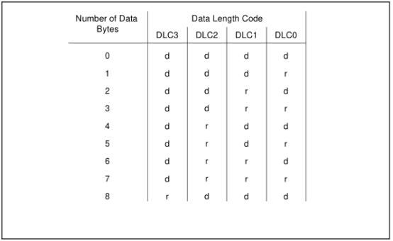 DATA LENGTH CODE,指出数据字节数量  DATA LENGTH CODE 编码 (d-“显性” r-“隐性”),数据段最多8字节  数据段,最多8字节,每字节8位,高位先行
