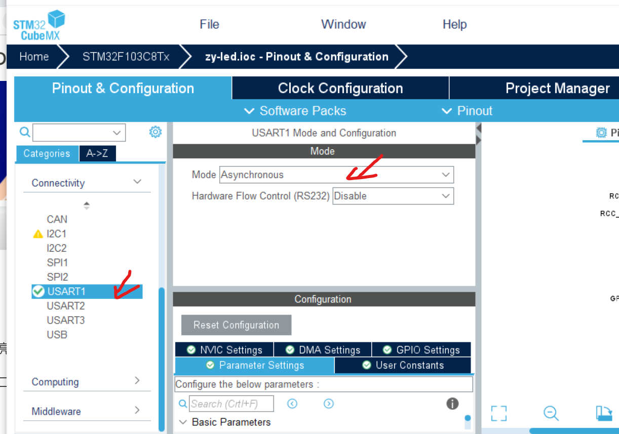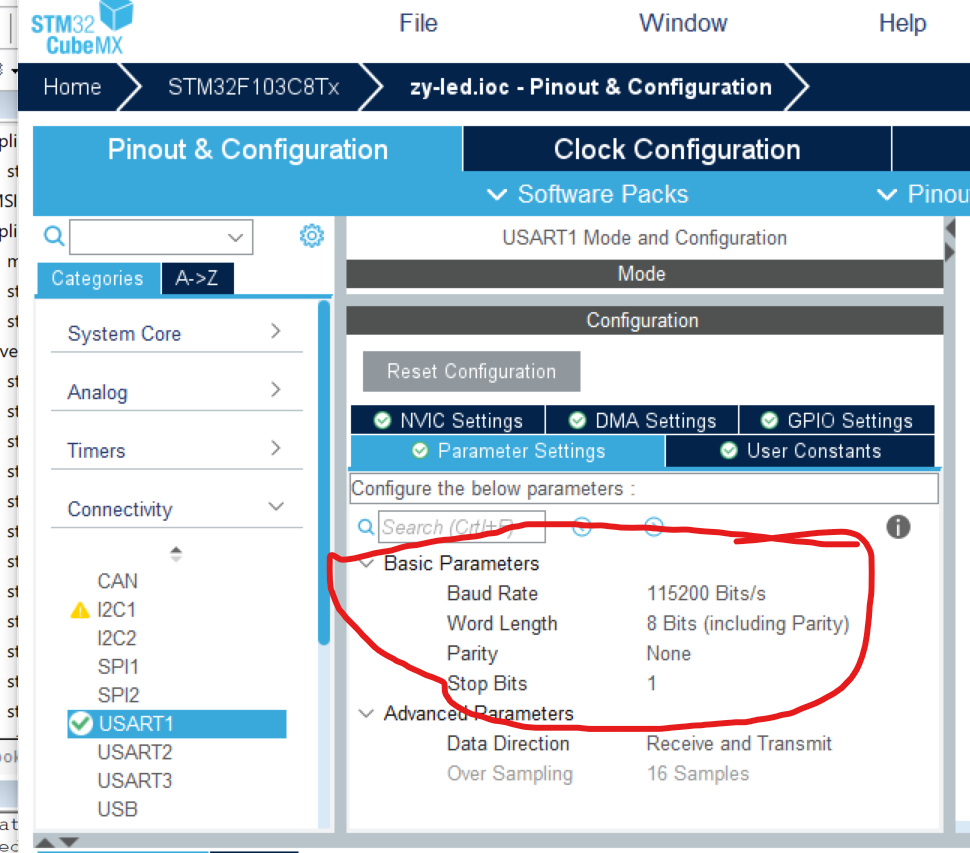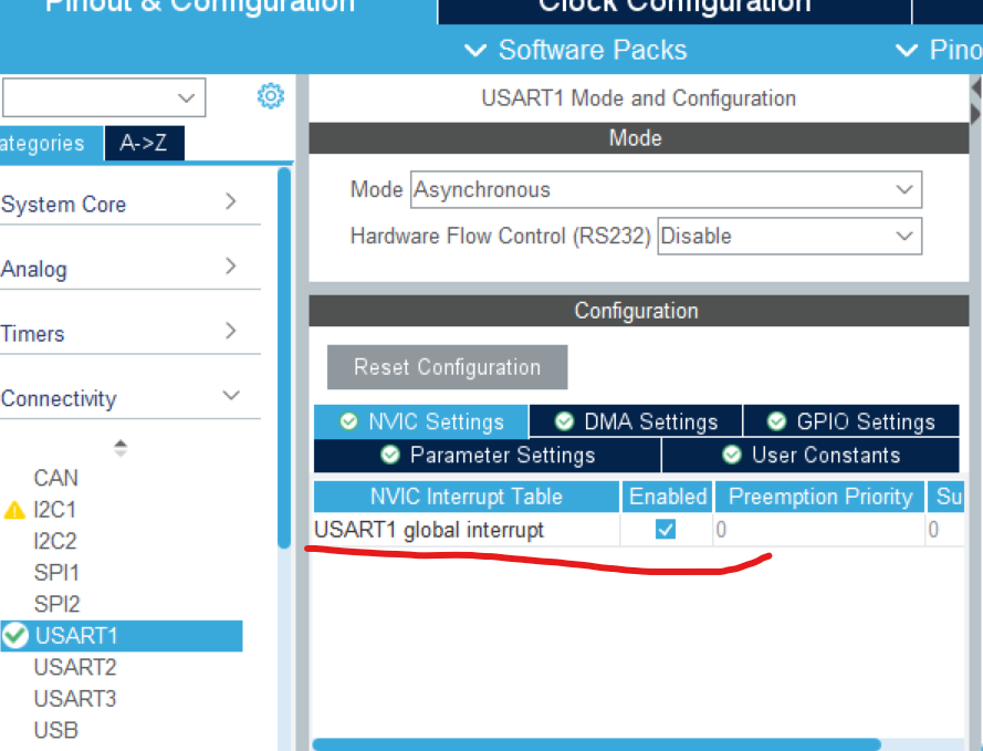 配置USART1为异步通信模式:  配置串口:  使能USART1中断  生成代码,打开项目。