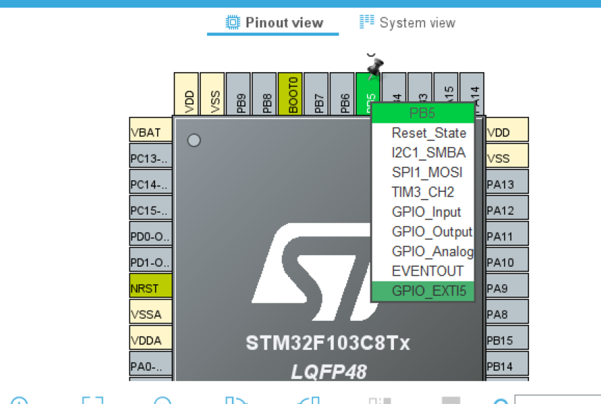 (1)选上自己的芯片类型,找到PB5,选择为GPIO——EXTI5中断模式  (2)PA1引脚设置为输出