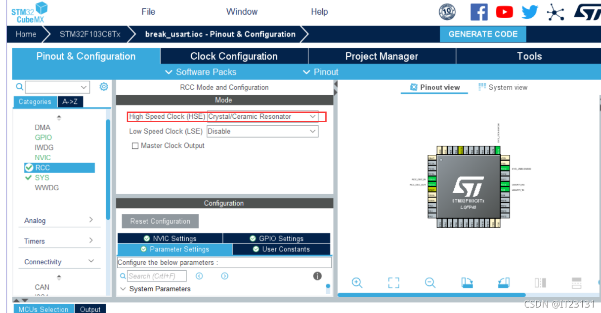 然后在Rcc里的HSE选择Crystal/Ceramic Resonator