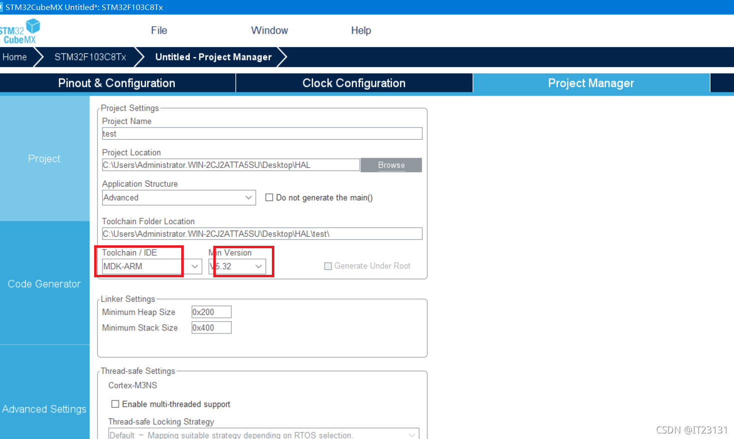 project里把toolchain那里改为MDK-ARM,版本选择最新的就行了,项目名和项目路径自己选择