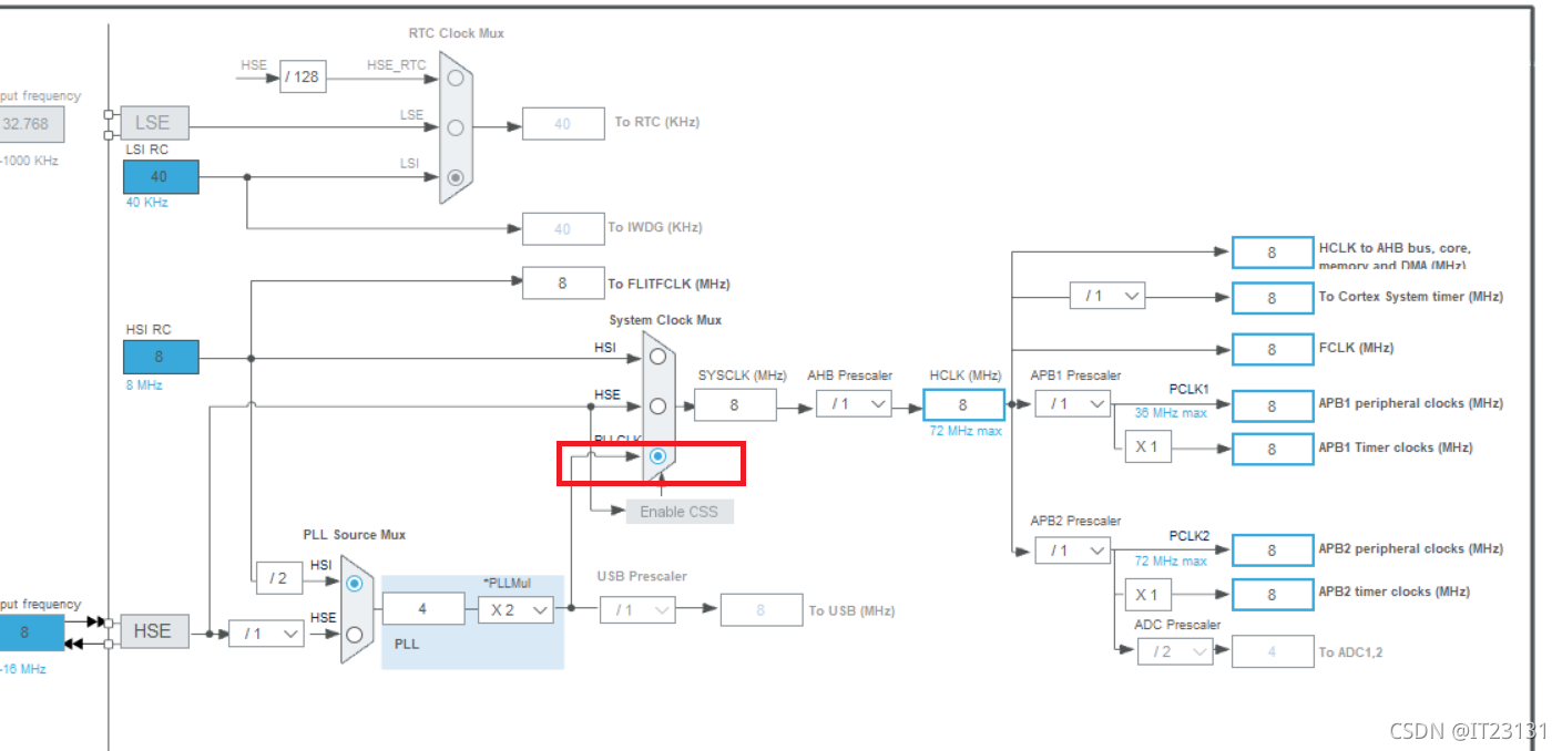 选择PLLCLK,然后将后面的晶振频率最大值改为72M赫兹