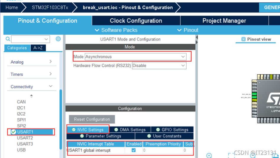 ?选择UASRT1,将mode改为异步通信,选择下面的NVIC Setting,将enabled选上