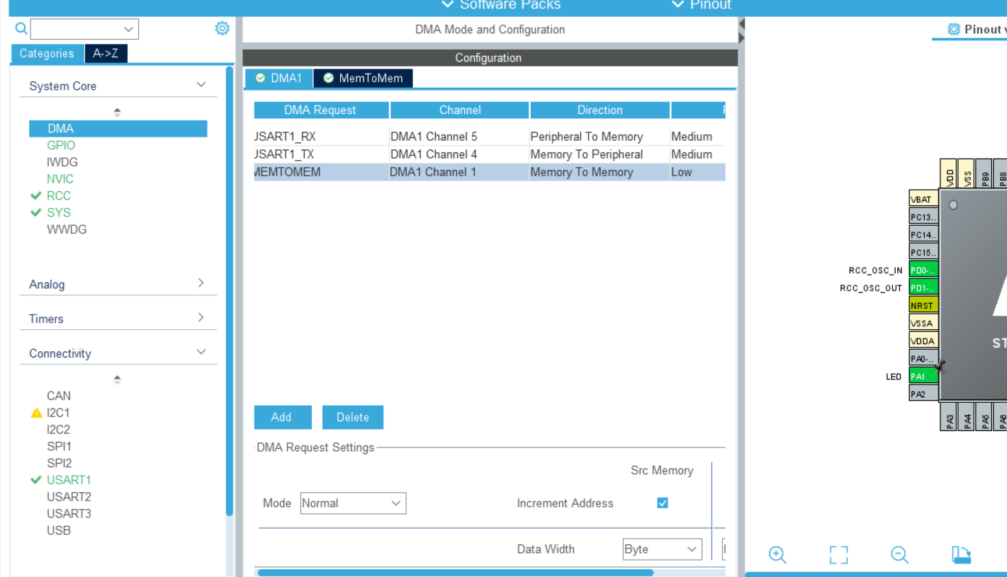 DMA直接内存存取原理. DMA 是指外部设备不通过CPU而直接与系统内存交换数据的接口技术。. 要把外设的数据读入内存或把内存的数据传送到外设,一般都要通过CPU控制完成,如CPU程序查询或中断方式。. 利用中断进行数据传送,可以大大 提高CPU的利用率 。. 但是采用 中断传送有它的缺点 ,对于一个高速I/O设备,以及批量交换数据的情况,只能采用DMA方式,才能解决效率和速度问题。. DMA在外设与内存间直接进行数据交换,而不通过CPU,这样数据传送的速度就取决于存储器和外设的工作速度 DMA设置 还是在usart1里面,DMAsettings里面如图设置