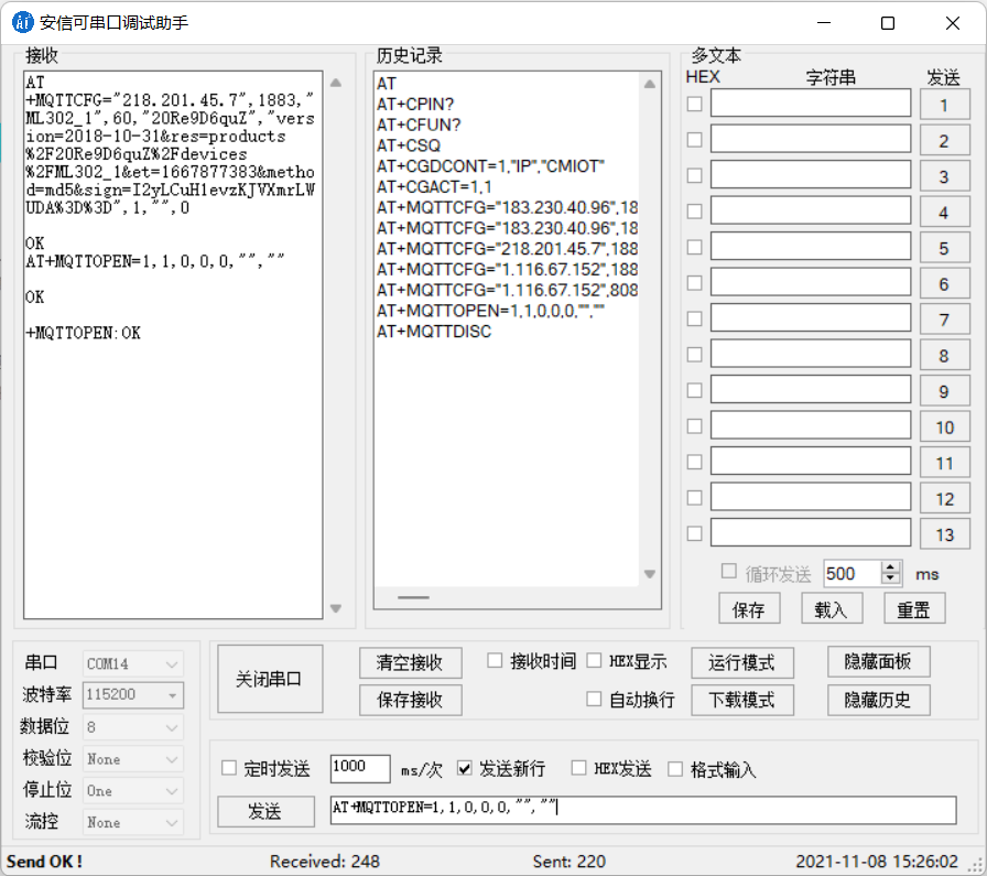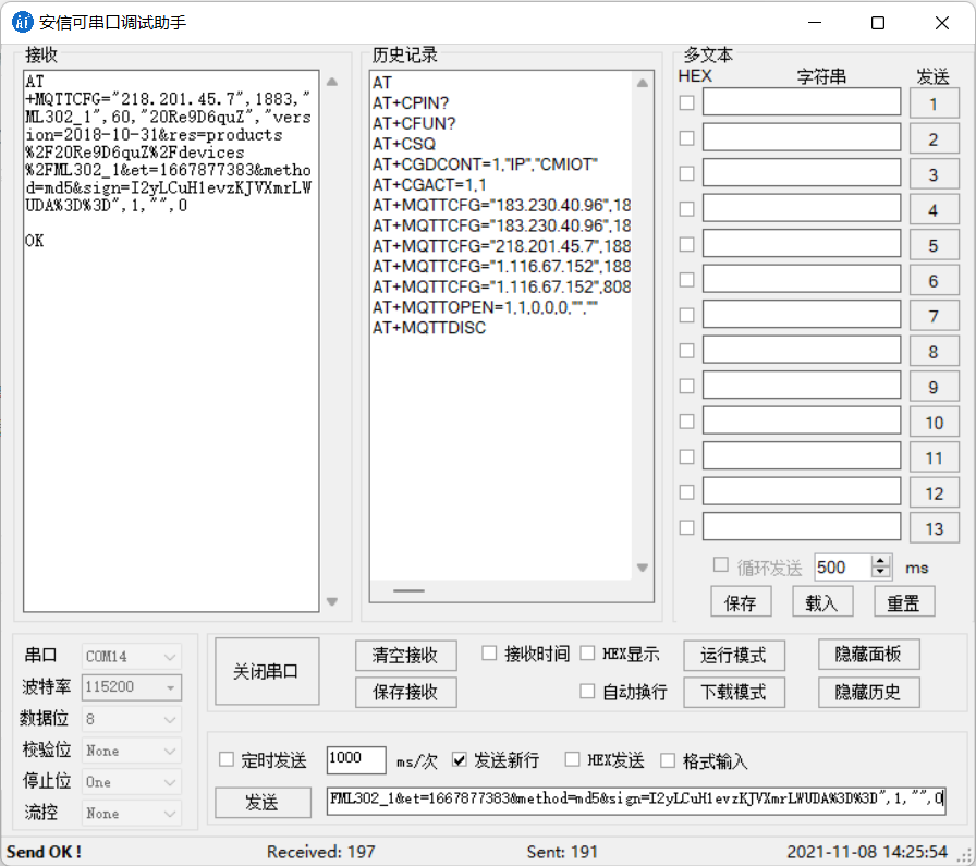 平台的MQTT服务器IP为218.201.45.7,端口号为1883,id字段填写之前日志中的"clientid",用户名和密码分别对应日志中的"username"和"password",如下为测试时发送的数据,返回OK说明配置信息已经存储到模组: