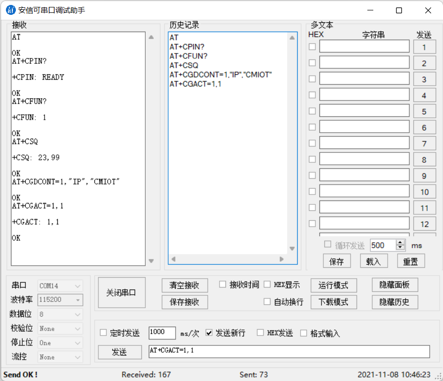 - 打开串口助手,选择对应的端口号,波特率设置为115200,勾选发送新行,打开串口后向设备发送AT,若连接正常设备回回复OK