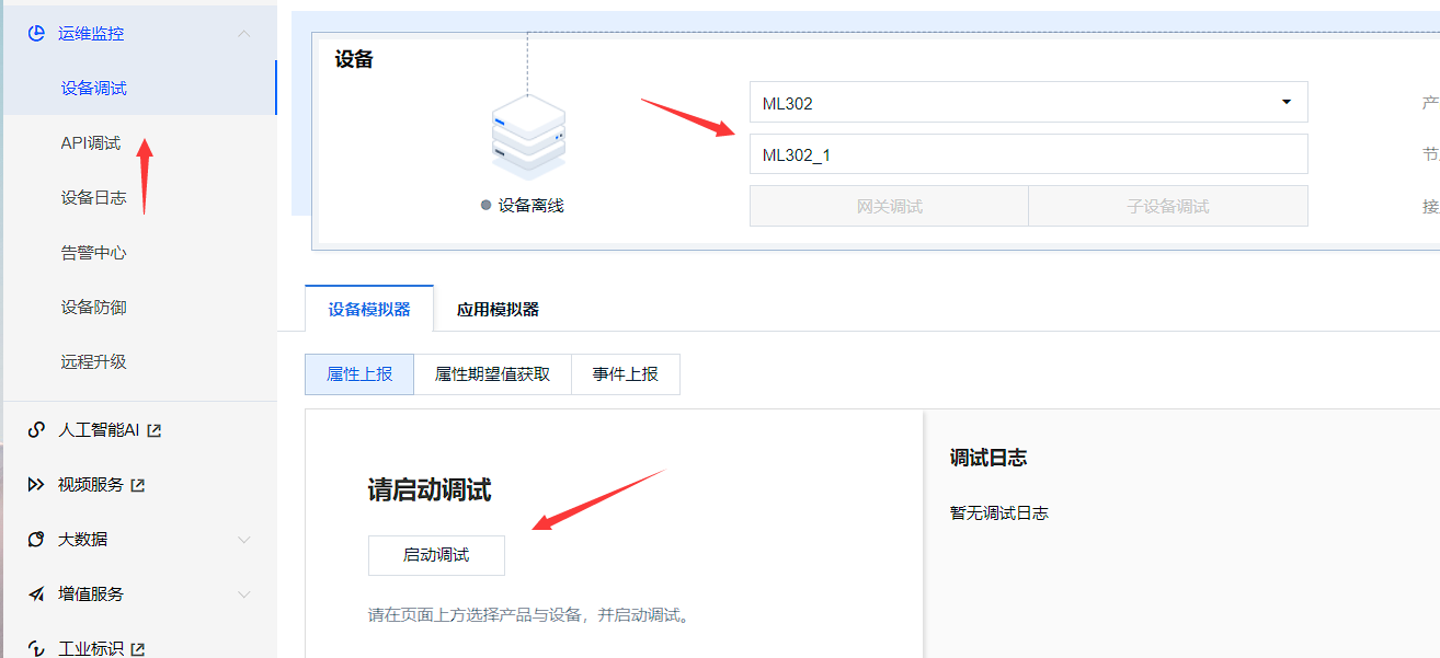 选择运维监控下的设备调试,并选择好产品与设备后,点击启动调试  可以看到调试日志栏中打印出了一条日志 {"clientid":"ML302_1","username":"20Re9D6quZ","password":"version=2018-10-31&res=products%2F20Re9D6quZ%2Fdevices%2FML302_1&et=1667887582&method=md5&sign=w1zIdZHGKv78zIVTSnQDqg%3D%3D"} 这个日志中的三个值是我们接下来要使用的。 (PS:获取到日志后点击停止调试,不然一会ML302会连接不上OneNet平台)