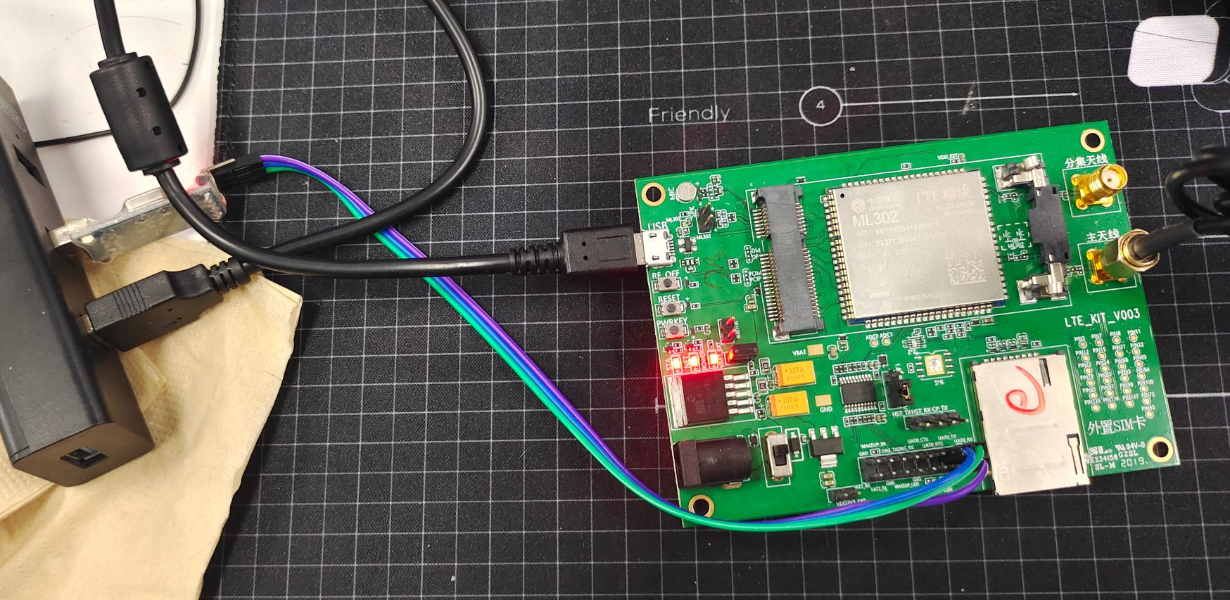 将跳线帽短接在图中两个红圈的地方  USBTTL与ML302的连接图如下  5.连接完毕后上电并打开开关,红灯亮说明板子正在工作